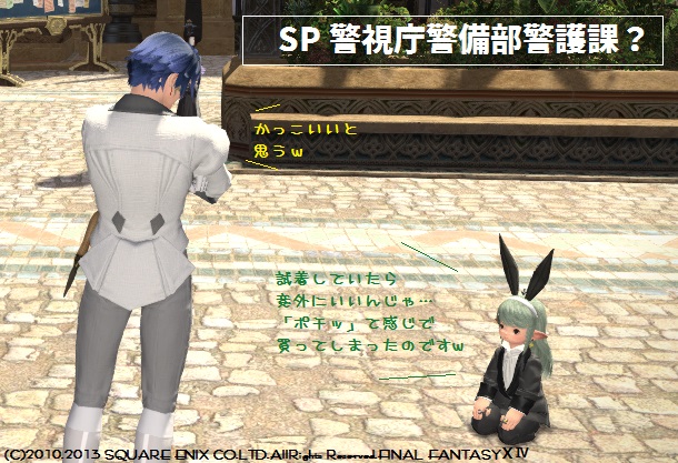 「なんでこんなの買ってしまったんだろうっっw」という声がしたので 振り返ったら、ベストマンジャケット姿のケロさんがいたのでした。 SP風でカッコイイと思うw 完成したゾディアックウェポンも見せてくれました。 「でも、モンクはしばらくおやすみなのです」 すちゃっと武器をしまいながら言うので、白魔道士のレベル上げをするのかと 思っていたら 「3.0がくるまでにクラフタをカンストさせますよ!」 高らかに宣言されました。 この人はまじめなので、きっとやる!(確信)ww JUGEMテーマ:フ...