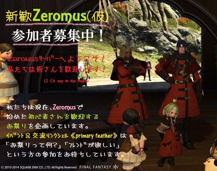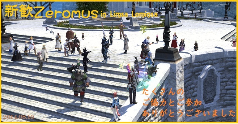 新しくFF14を始めて、ゼロムス鯖にやってきた若葉マークさんを歓迎する 「新歓Zeromus」第一回目がついにリムサで開催されました。 色々な方が告知に走り回ってくださったおかげで、当日は ビックリするほどの大盛況でした! キャラの表示限界をこえて、見えなくなるくらいw ヒーローショーは、相手が見えない状況でやるというかなりなムリゲーww お客様も「チャットを読む」という状態だったと思いますが 楽しんで頂けたようです。よかったよかった。 第2部の「みんなでIDに行こう会」は、参加してく...