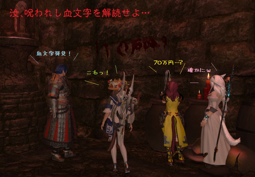 零細FC《B.W》にアリスさんが加入。 その記念に、タムタラツアーを敢行しました。 ゆっくり血文字を眺めたり手記読んだりしながら ワーワー言いながら恐怖を満喫するツアーです。 タムタラはその方が絶対楽しいと思うw 壁の血文字、70万円って書いてあるらしいよ?www(嘘) JUGEMテーマ:ファイナルファンタジーXIV: 新生エオルゼア
