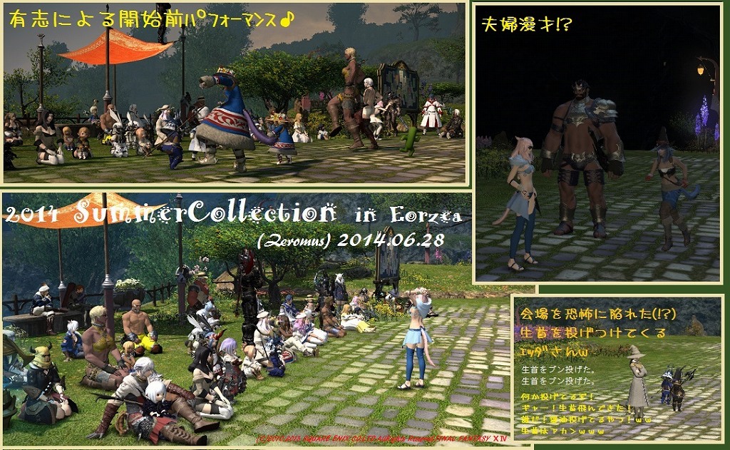 土曜日は、2014 サマーコレクション IN エオルゼアというユーザーイベントが ラベンダーベッド(グリダニア・住宅地)で開催されたので 見学に行ってました。 過疎鯖と名高いゼロムスですが、それでも60人くらい集まってたそうです。 キャラクター表示限界を超えて、モデルさんが見えなくなったり 「PS3じゃ限界だ!」という声があちこちから聞こえるなど大盛況でした。 そして、写真を全部入れようと思うと、画像サイズが大きくなってしまったのであった。 すごく楽しかったよー! JUGEMテーマ...