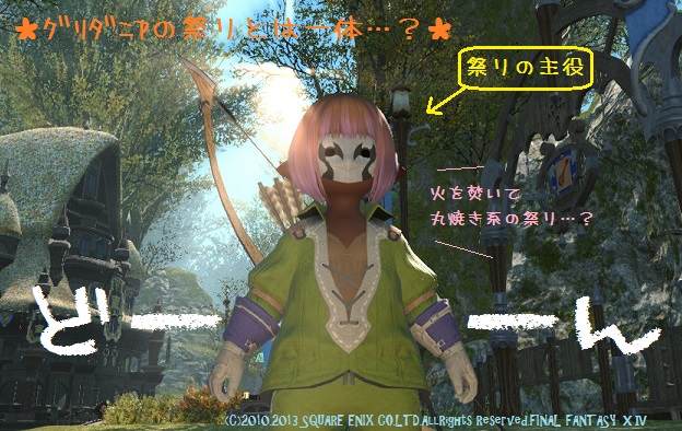 どこかでクラフターに励んでいる町長に話しかけながら 粛々とストーリーを進める褐色の天使(サブキャラ)です。 「原住民系」という予想外の評価wに戸惑っていると、町長の一言。 「一方、アスカちゃんは、真ん中で火にあぶられてるイメージww」 「生贄ですか!!?ww」 アスカは「生贄系」らしいですwww そんな他愛のない話をしていると、カヌエ様が現れ うちの褐色娘を祭りの主役に選んでいきました。 木工ジョークで人気者のベアティヌ先生が魂をこめたであろう 怪しい仮面も、グリダニアの祭りには必須ら...