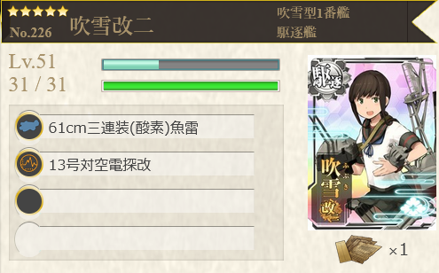 削り時の編成で出撃 01:△A/陽炎 敗北数が増えるのは嫌いだしボスは余裕っぽいので航空隊を潜水マスに投げることにする 単縦陣で行く想定なので昼火力も考慮して旗艦は能代 02:○S/瑞鳳 03:△A/陽炎 04:○S/翔鶴 05:△A/宗谷 ☆ あまりに昼にボロボロになったので航空隊をボスに戻して対空をアトランタ、フレに対潜をさせる案を検討していたけどこれで終わり 残り資材;燃料18.5k/弾薬24.8k/鋼材23.9k/ボーキ28.7k/バケツ2196個 消費のほとんどはE4-4堀 さて、日進堀とウィー...