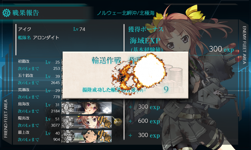 JUGEMテーマ:艦隊これくしょん -艦これ- バレンツ海を突破したグレイル艦隊。 しかし、度重なる輸送任務により、艦娘達は疲弊し、 資材や高速修復材もどんどん消費され、 ついに高速修復材が底をついてしまっていた。 鳥海「ようやく輸送作戦終了しました。」 アイク「ああ。気が付けば残り機嫌もあとわずかだな…。」 最上「輸送任務でこれだけ時間が掛かっちゃったら、もう攻略は不可能じゃない?」 アイク「そうだな…。せめて今の海域だけでも突破...