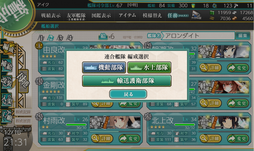 [ゲージ1:輸送護衛] 第一艦隊:春風/伊勢/日進/朝潮/村雨/巻雲 第二艦隊:アトランタ/初霜/霞/長波/沖波/島風 航空隊1:銀河*2/野中/陸貞 →Q集中 航空隊2:隼64/SpitV/隼III+MAX*2 →G/K 航空隊3:東海*4 →Q集中 01:○S-145/鳳翔 雑装備にしてるから4回では届かない。 まあどうせどこかで不運拾ってA取るだろうからヨシ 02:△A-101/- 島風が連撃当てない件 03:○S-145/叢雲 04:○S-145/長良 05:○S-64/- [ギミック1-1:輸送護衛] 第一艦隊:春風/伊勢/日進/朝潮/村雨/...