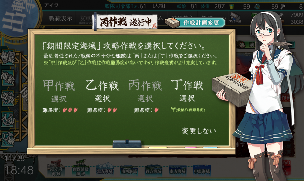JUGEMテーマ:艦隊これくしょん -艦これ- アサギリ「あれ?アイクさんは?」 エフラム「アイクの奴、この前から鎮守府に籠りきりだ。期間限定海域とやらで苦戦してるんだろう。」 アサギリ「ブラウザの丙作戦とアーケードの丙作戦は意味が違いますから、着任して半年満たないなら丁作戦でも恥ずかしいことはないと思いますけどね。それも含めて悩まれてるんだと思いますよ。」 エフラム「最低でも丙だって意気込んでたからな。でも、お前の目的は、ブラウザの艦娘の性能をアーケード実装より先に手に入れる事...