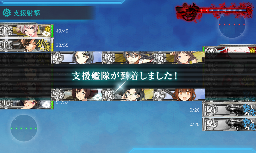 色々あって出撃するタイミングを逃したので後段の情報待ってからでいいやとなり、一昨日から開始しました。 正直やっぱりこの後段開放仕様は嫌い。 友軍も嫌い。 で、結局何を誰を使って誰を残せばいいのさ? 正解がわからないけど特効で強いのが島風、霞、長波、ジョンストン、フレッチャー辺りのようなので後は大丈夫とする。 [ゲージ1] 第一艦隊:アブルッツィ/アークロイヤル/マエストラーレ/ポーラ/グレカーレ/イタリア 航空隊1:銀河*3/野中 →J集中 01:△A-/1残し 制空取れて...