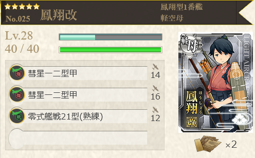 JUGEMテーマ:艦隊これくしょん -艦これ- 鳳翔編(進水日 1921年11月13日) 鳳翔「アサギリ提督。鳳翔、参りました。」 アサギリ「まず、装備はどう?リクエストある?」 鳳翔「今はこれで特に問題ございません。」 アサギリ「そう?」 鳳翔「私は、そもそも性能が高くありませんから、あまり活躍が見込めないと思いますよ…。」 アサギリ「まあ、確かに練度があまり上がってないよね。昔からそうだったの?」 鳳翔「第一次上海事変、日中戦争などに参加しましたが、小型の上2...