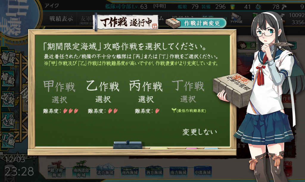 JUGEMテーマ:艦隊これくしょん -艦これ- 遂に始まったアイク提督初の期間限定海域。 しかし、通常海域とは大きく勝手が異なり、 難易度乙では、全く歯が立たなかった。 アイクは、大淀に難易度の変更を早くも要請するのであった。 大淀「こちらでよろしいですね。」 アイク「すまん、大淀。期間限定海域を甘く見ていたようだ。」 大淀「いえ。速いご決断、とても賢明だと思います。」 アイク「前にも言ったが、丁だけはやらんぞ?最低難易度しかクリアできない提督とあらば、...