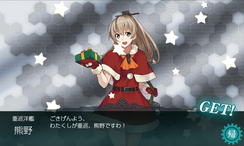 JUGEMテーマ:艦隊これくしょん -艦これ 発動!MG1作戦が始まり、早くも一週間が経過。 グレイル艦隊は、少ないながらも確実に輸送ゲージを減らし、 遂にあと一回成功させることで、輸送任務が完了に到達する。 グレイル艦隊の勝敗の行方は如何に? アイク「俺はアイクだ。よろしく頼む。…ずいぶんと珍しい格好をしているな…。」 熊野「あら?アイク提督、ご存じありませんの?もう季節は冬ですから、クリスマスの時期ですわよ?」 アイク「クリスマス?ああ、アサギ...