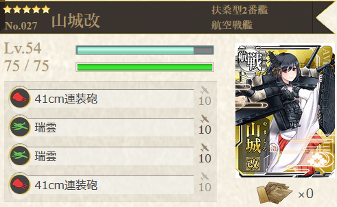 JUGEMテーマ:艦隊これくしょん -艦これ- 山城編(進水日 1915年11月03日) アサギリ「今日は山城さんか。姉妹で練度に偏りがあるのは、やはり付き合いの長さ故か…。」 山城「アサギリ提督。来たわ…。」 アサギリ「ああ、早速始めようか。まず装備だが、リスエストある?」 山城「…とりあえず瑞雲2スロットはやめて。いくら航空戦艦だからって2スロット分積むことないから。」 アサギリ「だよな。徹甲弾がいい?それとも超長主砲?」 山城「うーん。三式弾はダメ?」 アサ...