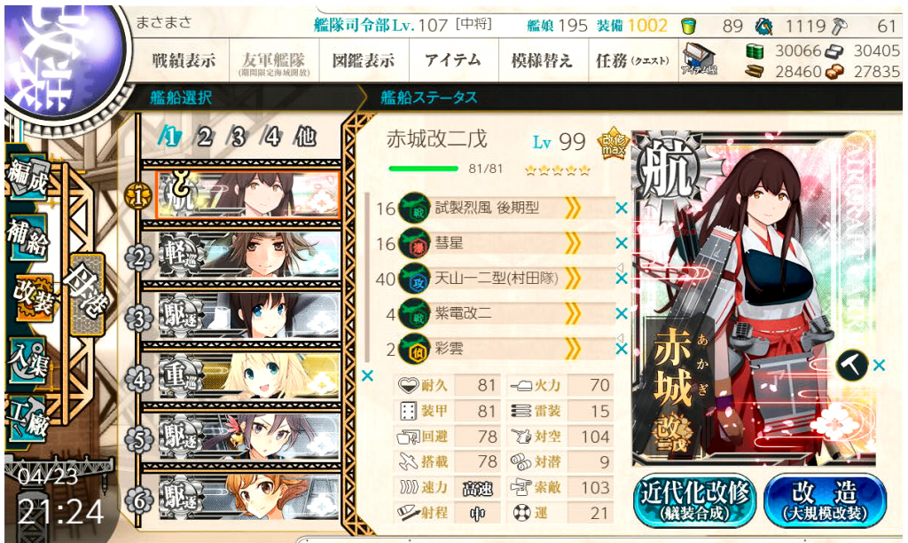 JUGEMテーマ:艦隊これくしょん -艦これ- どーも!まさまさです。 家探しをそこそこにしている日々ですが、今回は、緊急事態宣言が発令され、また、転職先のweb面接のwの字もなかったころのお話です。 去る4月23日 7周年のお祝いに沸いていたころ ある艦娘とケッコンカッコカリを行いました! その娘は前日の4月22日が進水日でした。 当日は当直だったので翌日にずれたのです。 その艦娘は 空母赤城 &...