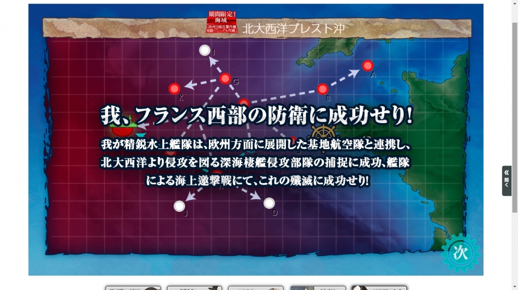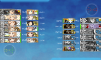 やること多すぎて記載ミスがありそう(汗 ・OマスA勝利*2 ・KマスS勝利 ・EマスS勝利 ・基地防空優勢*2 でボスマス出現だとか。 まずOマスを目指す。 [水上打撃部隊]高速統一、艦戦3爆戦1水戦1で制空340超 第一艦隊:ネルソン(高速)/アイオワ/満潮/熊野/荒潮/千歳 第二艦隊:ガリバルディ/ポーラ/荒潮/ザラ/北上/ジョンストン 航空隊1:陸偵/隼/陸攻*2→目的地 航空隊2:陸偵/隼/陸攻*2→目的地 航空隊3:東海*4→F 4スロ水母2の編成が多いみたいだった。 とはいえO...