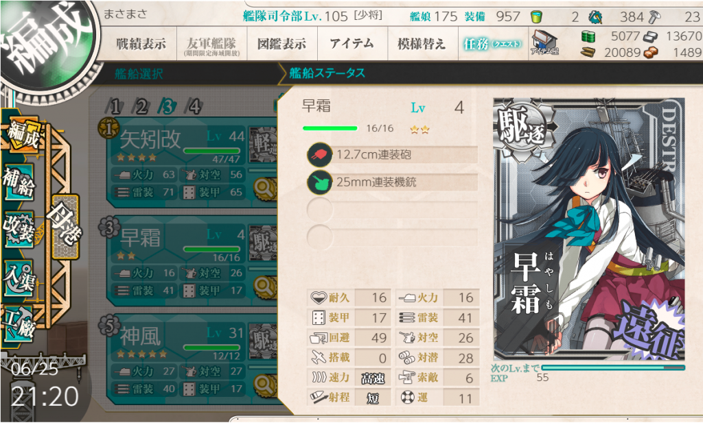 思い出したように駆逐艦の耐久改修に挑戦。 合計Lvが106からパラメータが2つ上昇するらしいってことで少しずつ育てていた占守53と国後53を投入する。 → 確かに2つ上がったけど、対潜と運じゃねーか!! ぐむむ...また海防艦を育て直しだぁ。 JUGEMテーマ:艦隊これくしょん -艦これ-