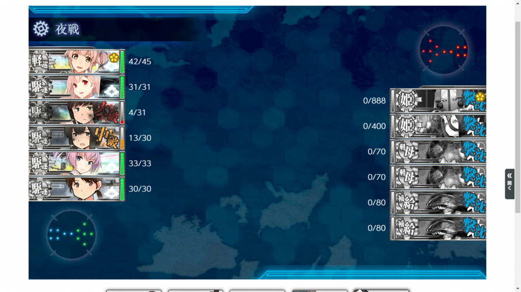 合間で2-4を回ってたので前回の続きとして結果を。 45:○S伊勢 46:×S母港限界 47:×3戦目駆逐大破 48:◎S神威 49:○S利根 50:○S朝潮 51:×2戦目駆逐大破 52:○S霧島 53:○S扶桑 54:×2戦目駆逐大破 55:○S霧島 56:○S比叡 57:×3戦目駆逐大破 58:○S伊勢 59:○S浜風 60:○S浜風 61:○S日向 62:○S伊勢 63:×左下に行った 64:◎A瑞穂 65:○S日向 66:×左上に行った 67:○S大潮 68:×A黒潮 69:○S日向 70:○S扶桑 71:○S雪風 72:...