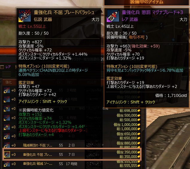 「伝説の武器55は取引所で購入しました」 と、桜さんとお話をした時、私もそうしようと決断したのでした ドロップで以前手に入れた50武器は、鑑定やオプションが惨敗だったため、強化はしないで、45レアのまま今まで来ました ちょうど今日、ざっと見たところ、能力的に良さそうな、そして異様に安いお値段の武器があったので、ここは迷わず購入しました 早速、強化です! ぱぁ〜っと、大盤振る舞いで、+9まで強化してみます 強化費用のメモ +1 26120 +2 26642 +3...