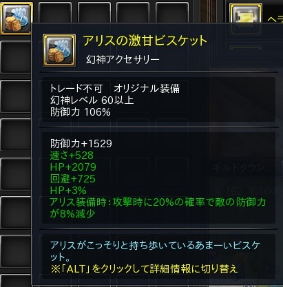 JUGEMテーマ:幻想神域 -Innocent World- どうもこんばんわ 最近もちべが高いです斧男です そんなわけで色々近況報告的な感じで書いていきます がんばります まずはこれです でちゃいましたw 破防がない自分にとってはまさに救世主 ためしに書庫と殿堂地獄をソロしてみたらだいぶ楽になりましたw 書庫に関しては防具+20とかいう地雷な僕でも がんばれば6分切れそうです いやぁ・・・防御減ありがたや〜です でもデバフが付く確立が少々微妙なんですよね まず、ボス直などをするとアリスのスキル...