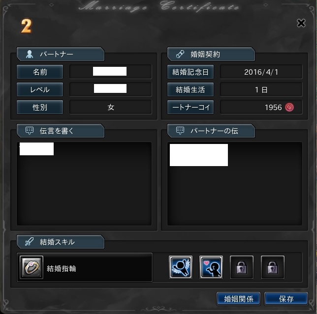 JUGEMテーマ:幻想神域 -Innocent World- どうも斧です 突然ですがなんと私、4月1日に結婚してしまいましたw(ゲーム内でです) 相手は同じギルドにいる琴さんです ガチガチです@@; とまぁ、こんな感じでw 相方さんからパートナーになろうと言っていただき それから結婚したのですが、 正直そんなこと言われるとは思ってもいなかったので、 すごくおどろいていますw ちなみに 相方さんはすごくいい人ですw それに意外と思いやりのある方で周りの事もよくみてますw 自分はメインの周回が終わった...