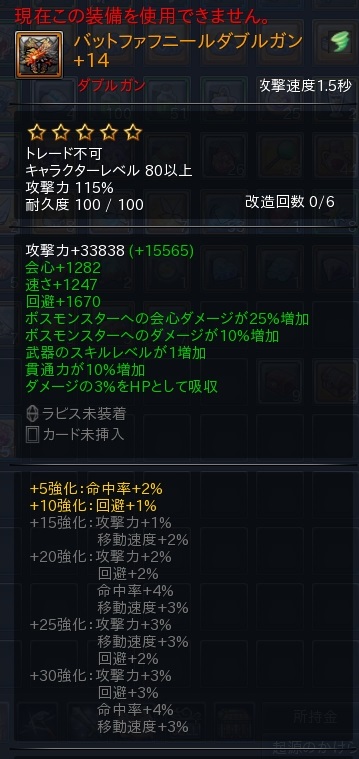JUGEMテーマ:幻想神域 -Innocent World- 唐突ですが、なんとなく銃やりたくなったので 銃つくりました斧です 1発勝負、安定の低補正w とりあえず手持ちの強化書で15まであげました 画像のは欠片切れで14ですがw サブのもつかえば17くらいまでいきそう 因みになぜバットかというと、 サブ武器に破防手裏剣を持たせたかったからですw 風スキル幻神いるので楽かなぁとw 本当は手裏剣30まで強化してから銃作ろうとおもったのですが、(まだ22) 正直手裏剣は強すぎて飽きてくるので後回しに...