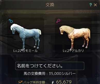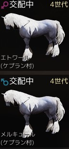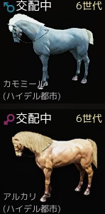 JUGEMテーマ:黒い砂漠 こんにちは。 馬の交配結果です! 先日言ってた2匹での交配です!! から・・・あ・・・げ・・・ でもからあげ前7世代を交換でつれてきたし・・・・ と思ったらメス!!! メスは交配回数が少ないので嬉しいんだけど・・・ よさそうなオスが今欲しいのです(ノД`)・゜・。 まぁ、大事にとっておきます! <手持ちのお馬さん>