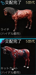 JUGEMテーマ:黒い砂漠 交配済みのあんりが売れないので、4世代♂を購入して交換しました。 5世代♀! <手持ちのお馬さん>