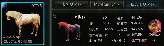 JUGEMテーマ:黒い砂漠 さて、給料日前!ということもあり、♀馬の交配を復活させました。 再挑戦です(・ω・´) 前回同様♂♀LV30での交配。 結果は・・・・ ですよね〜 6世代が帰ってきました・・・ まぁ、♀なのは救いです。 が、この子は既に1頭いるので、違う子に来て欲しかった・・・(・ω・) で、今回交配に使った♂はレース用に保管する事にしたので、 ♀を、移動用、馬交換用、ラクダ交換用、一応2人乗りを覚えたのでネタ用としての 需要を探るべく市に出してみました。 価格は上記の通...