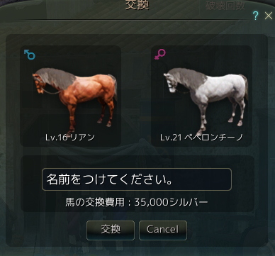 JUGEMテーマ:黒い砂漠 おはようございます。今日やった2匹の交換結果は・・ またもや男の子。 すぐドナドナ登録となりました! その後しばらく馬捕獲はしないとか言っていながら、うっかり(?)ロープを10本購入してしまいました。 で、回ったところ 4匹中3匹♀という結果に!買ったうち3本は残ってるんで、あとでまたちょっと捕獲に行ってみて今度こそしばらくおやすみです。 そういえば、1つ前の記事で画像をのせた、愛用している5世代角刈りちゃんが29レベルになってドリフトを覚えま...