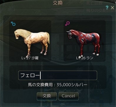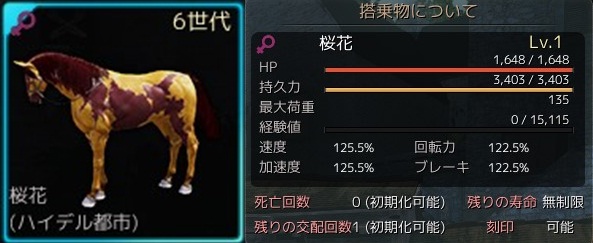 JUGEMテーマ:黒い砂漠 さて、必死に走りまくった一週間! 6世代と5世代の交配結果は…5世代♀と6世代♀でした。 6世代♀は嬉しいなぁ〜 それにこの馬は既存の6世代茶馬より速度的には性能良いし、 なんせ7世代の実績も豊富! とりあえずは上世代の種は増えた。 しかし7世代輩出にはやはり過去実績に準じるべきなのかな… もしくは交換で奇跡が起こる事に期待か。。。 とりあえず、馬育成&交配・交換の日々も一カ月が経ちました。 LVは専門6まで上がって、栽培も順調です。キャラレベは停滞してますが...
