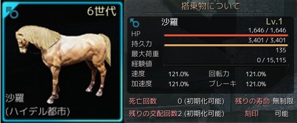JUGEMテーマ:黒い砂漠 さて、週末も走らせまくりました。 1世代野生馬♂♀を捕まえて、育てて、やっととりあえずの目標だった 6世代を自力輩出できました(ー`) 調教LVもそこそこ上がりましたが、ニンジンを自給自足してたお陰で栽培LVも上がってたw 今回の交配は「4世代 × 4世代」 して、結果が。。。。この6世代。 黒いのが欲しかったのですが、この子はこの子で綺麗な馬です。 しかし!オス!!!! 4世代♀はまだいるものの、30までまた上げるのはしんどい(Д`;) 交換に期待して・・・・結果が・...