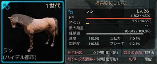 JUGEMテーマ:黒い砂漠 さて、またまた3連休もあっさり終わってしまった今日この頃です。 念願の初交配しました(`Д´)ヾ デアリマス。 1世代でも高LV交配なら飛び世代が産まれるとは聞いていたけど… 実際の結果を残しておこう。 --------------------------------------------- 交配1回目 --------------------------------------------- ♂:1世代 LV30 ※経験値はMAXではありません ♀:1世代 LV30 ※経験値はMAXではありません 仔馬:4世代♀ --------------------------------------------- 交配2...