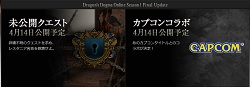 JUGEMテーマ:ドラゴンズドグマ オンライン シーズン1ファイナルアップデート 「シーズン1.31」の実施日が 4/20(水)に決まりました 本日、ファイナルアップデートで 開催予定の「カプコンコラボ」で 入手できる装備のシルエットが 先行公開されました (C)CAPCOM CO,.LTD. 2016 ALL RIGHTS RESERVED. こ、これは…男性キャラ用装備?は 鎧っぽいシルエットですが、女性 キャラ用?の方は、頭に何やら 長いものがついているようですね (;'∀') 戦国系かモンハン系なのでしょうか… ...