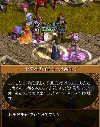 JUGEMテーマ:RED STONE 5日のアプデで、イベントやら機能やら色々追加されてたので一部を体験してきましたw オータムフェス 出席チェックイベント(〜10/31) 古都噴水下の広場のイベントガイドさんに話しかけると1日1個、計14回、アイテム貰えます。 毎日ではなくても、期間中に話しかければOKっぽいです。 サンチェリー…( ゚Д゚)まぁ、初日だからww ...