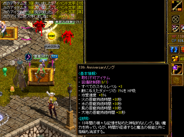 JUGEMテーマ:RED STONE 13周年のイベント。 去年もやったけど、フルチャだったから今回あまり期待してなかったですが 13th Anniversaryリング当たった!!!!!! これは嬉しすぎる〜♪(*^▽^*) でも前回みたいなキラキラエフェクトは無いのね…がっかり。 カバン見たらBox入ってたので開封式。 (13周年以外のBoxだったかもしれないw) お?券出たぞ! Goldが出てくる...