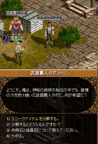JUGEMテーマ:RED STONE 本当、浦島太郎状態なんですけど ユニークアイテムを分解して、タティリス遺跡のかけらや 神秘の石のかけらに変えてくれるNPCがいるらしく 武器職人タポさん。コロッサスっぽいw G秘密行かない人には良いかもしれませんね〜 たくさんU持ってきたよ! Uを選択して、分解ボタンをポチッとな… タティリス遺跡の...