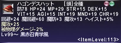 FFXIでもしたいことはいっぱいあるのに、ついつい新しいものに目が向いてしまい、FFXIVの方ばかり遊んでしまっています。それでもログインキャンペーンのためにログインだけはしているんですけどね(´ー`)そんな状況なので、ハゴンデスハットのオグメ付けには1ヶ月以上もかかってしまいました。ハゴンデスハット(魔攻+25)これでようやく5部位で+106(前回はこちら)。自分では最低でも+125まで頑張ろうと思っていたのですが、この調子だと達成する前にヨルシアスカームが寂れそうです(-_-)まだ前回及び前々回のログインキャンペーンでゲ...