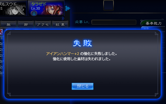 JUGEMテーマ:オンラインゲーム日記 あのすいません、牙6つ失くしたみたいなんですが、どこいったか知りませんかね・・・? -時は遡ること2時間前- 「あ、30武器の強化+3できるなー。牙7つあるし下の特殊強化もできるなー。」 「よし、ムルムルのレベル30なったしハンマーの特殊強化武器作ろ」 「牙5つで成功率100%、牙3つだと成功率75%かー。 まあでも75%ってことは4回に3回成功だから牙12個で3つ作れる計算だし、こっちでやるかー。」 「最初に失敗引いちゃったかー。まあだったらこっから...