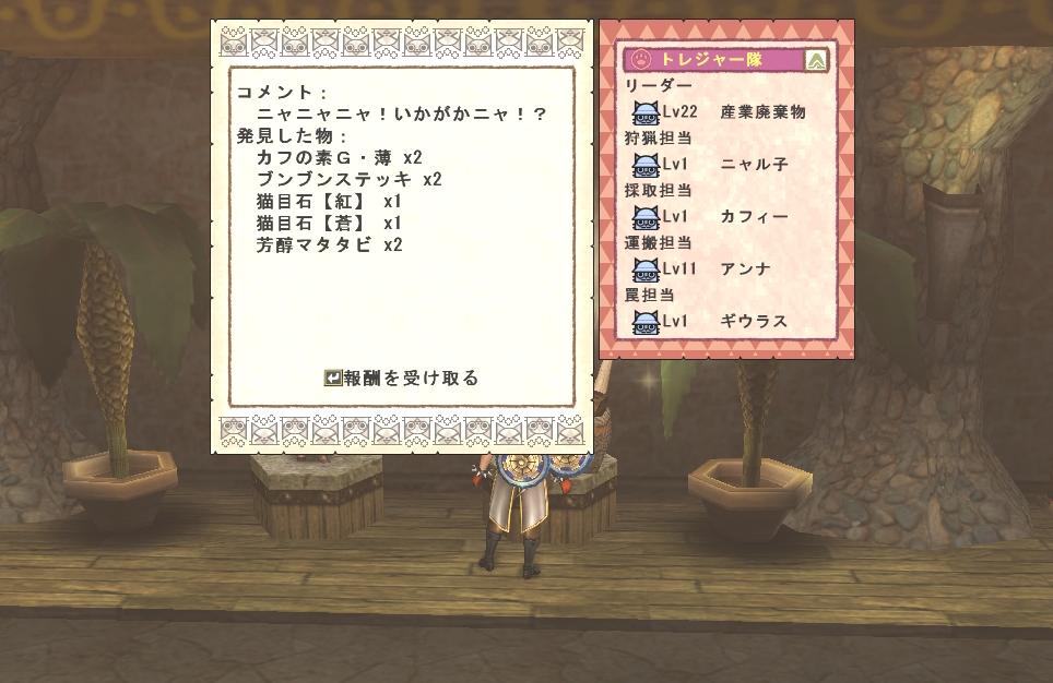 昨日の記録 朝にインして残り2枠になったトレジャー隊のお宝報告目指してトレジャー隊派遣、待っている間に大剣のMMをして火力インフレに備える、あるブログで闘覇スキルを組み込むとMM170弾まで完了していても攻撃力カンストするそうで、そこまでスキル充実させれないけど念のため進めておくようにしてみた。 マイトレで飲み屋のマスター候補のネコがなかなか出会わない ベスト着用が必須条件 マイトレのネコを統一させたいけど称号で合わせるか名前で合わせるか、それに毛色は同色にそろえるか各色1匹にして戦隊ヒー...