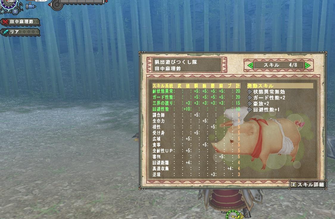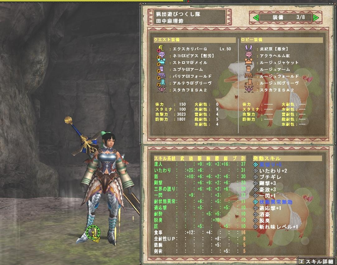 昨日の記録 朝にインして勝ち組クエスト、武器はリーチ長が使いやすいのでランスの祭武器が欲しくて風魂石デュラ、1戦して塔のBCスタートが新しいクエストの秘境前スタートに慣れてしまったからか面倒。HCでもクリアできたので募集してパーテーで4戦して風魂石はそろったけど熱気が足りなかった。 団訪問レスタがリアさんなので歌姫ストーリーのイナガミを受注してクリア 伝説のトキシが組んだ装備とは思えないスキル構成 言葉使いは酷いが腕は良いリアさんがガンガン攻撃してMはガンガンの「ガ」くらい攻撃しては被弾して...