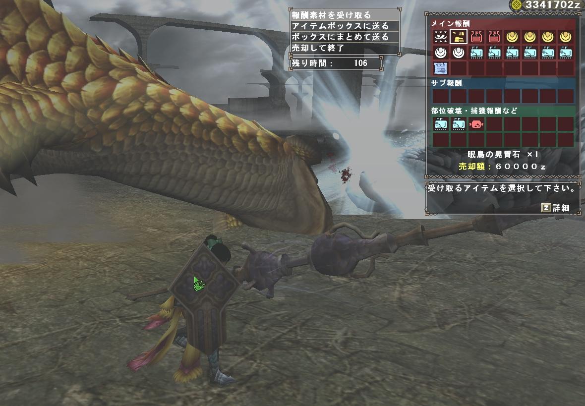 昨日の記録 朝にインして巨大魚杯の中間結果確認して大食いマグロはDランクでも100位チョット、他は2桁順位で極限征伐に2頭難関クエストなどで参加者が少ないみたいで匠チケット収集チャン〜ス! 親切な小部屋さんでG級モノブロスの肉質データがもう掲載されていて弱点は雷と氷属性で風属性武器なら効果的?と思いガルバハンマー(手持ちの唯一烈種武器)で戦ったけど属性は正解なのだろうが戦闘スキルが不正解で10分オーバー・・・。2回目も変わらずでイベント立ち上がれG級ハンターのクリアは断念。 デイリークエスト...