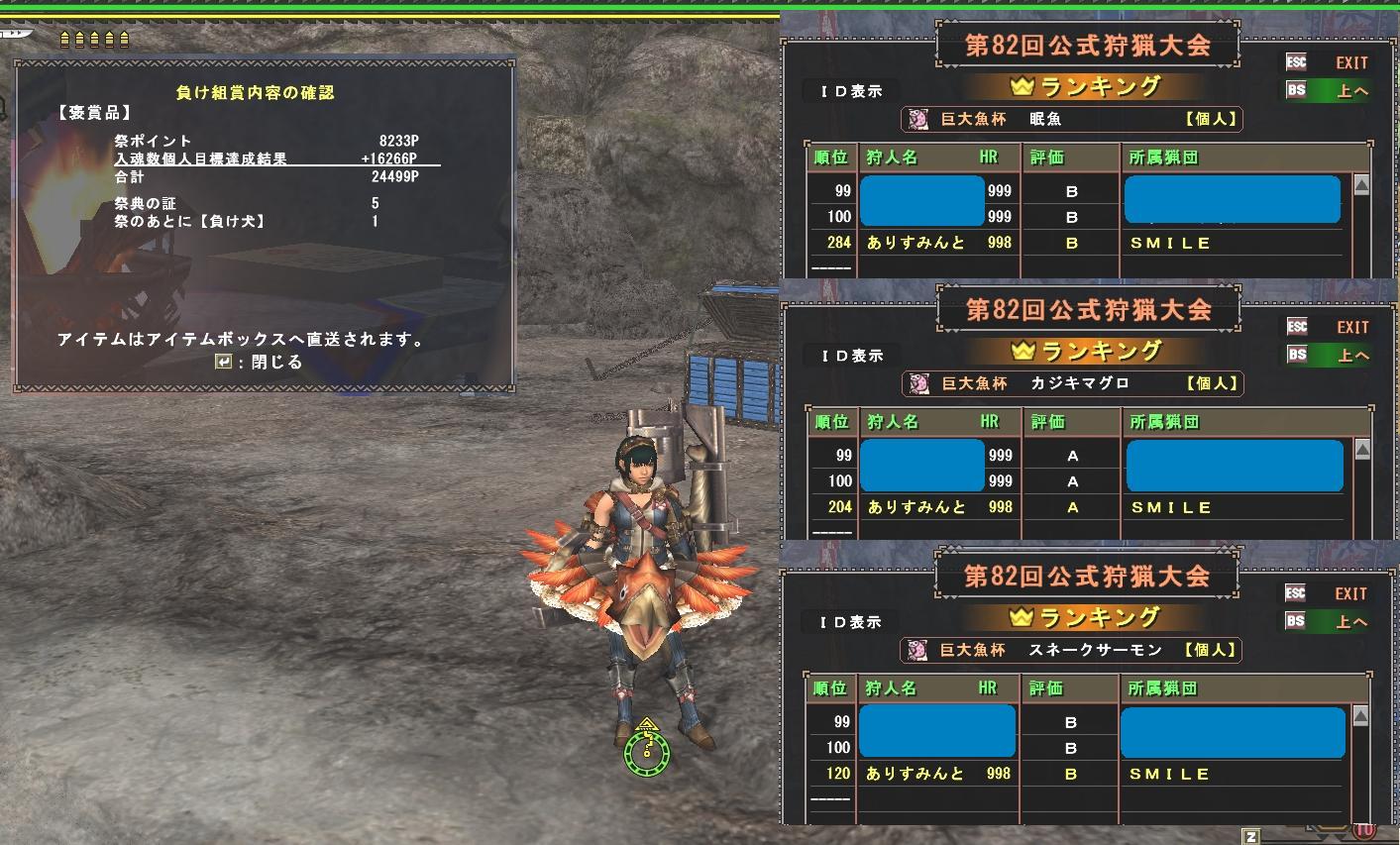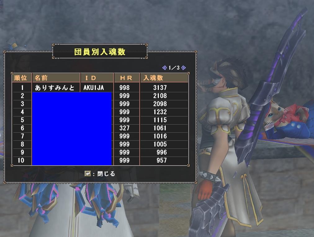 昨日の記録 朝にインして未消化のイベント「立ち上がれ!G級ハンター」を防具ひとつGFにして素材不足でそれ以上は出来ずGヒプノ連戦するのも気が乗らないのでパス。早く起きだしたせいで6時になって眠くなり仮眠、7時過ぎに目が覚めたら同盟チャットで試練が逆襲レウスとのことであわてて連戦、G級装備で死亡の危険性排除してエクスカリバーG50を振り回せていれば2〜3分でクリア。気短の護符で機関時間を30秒にしているから剥ぎ取りしきれないのでHCにもせずに8時までがんばって5000入魂達成! お一人がんば...