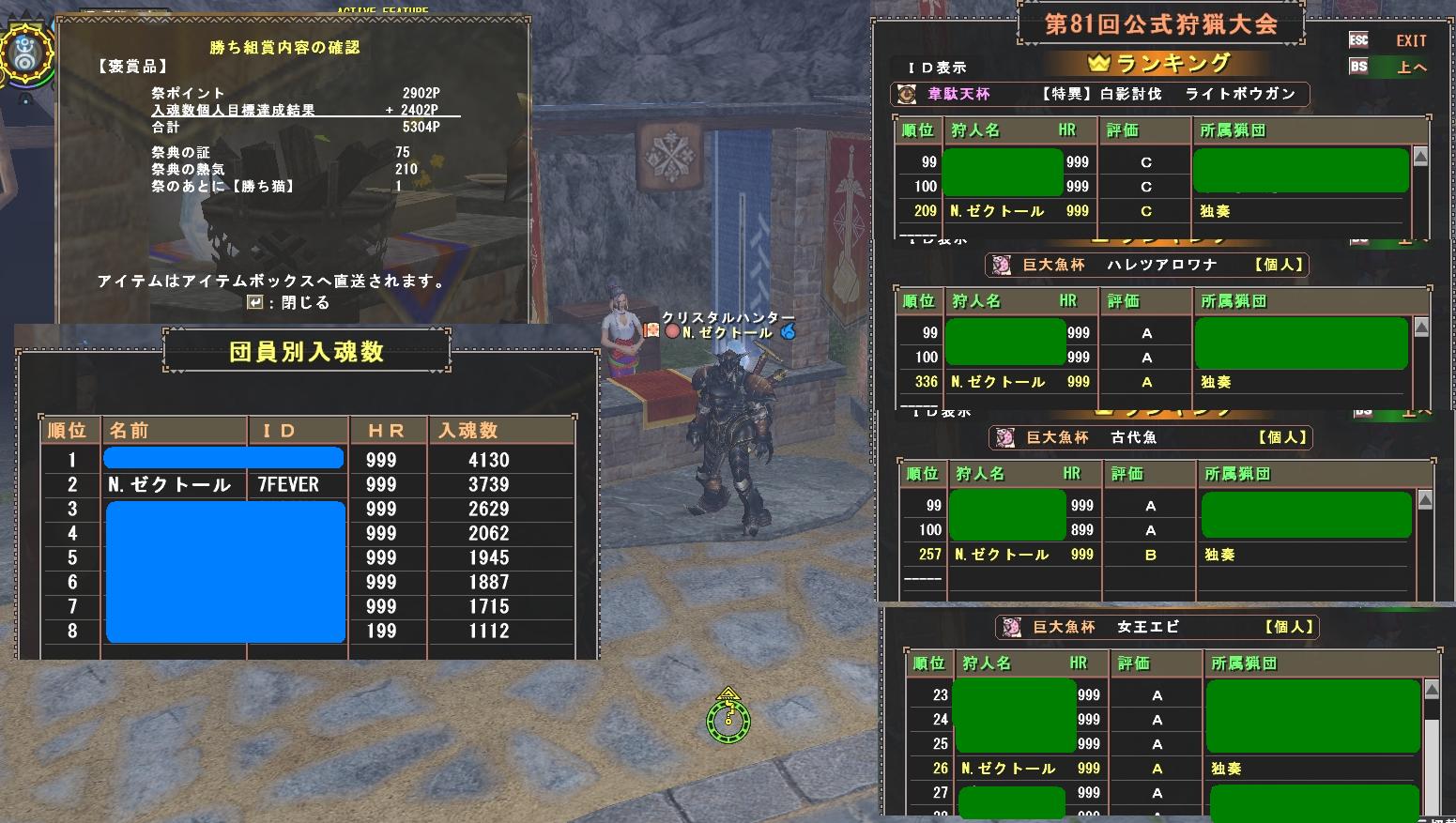 昨日の記録 朝にインして巨大魚杯の最終中間順位を確認、入賞はできそうなので一安心。ということでファーストキャラKにチェンジしてブーストタイムは使わずに巨大魚杯をする。ここでもセンサー?発動でスネークサーモンは1匹目で超えれなかった100?をあっさり超えてしまう、それも100.48と微妙な超え方・・・だったけど。Kでは眠魚もカジキマグロもあっさり入賞圏内の記録を出してログアウト休憩。 天気は予報どおり台風の影響で大荒れ、ニュースでも各地の被害が報道されている。準備しておいた食材で昼食をとってAでカ...