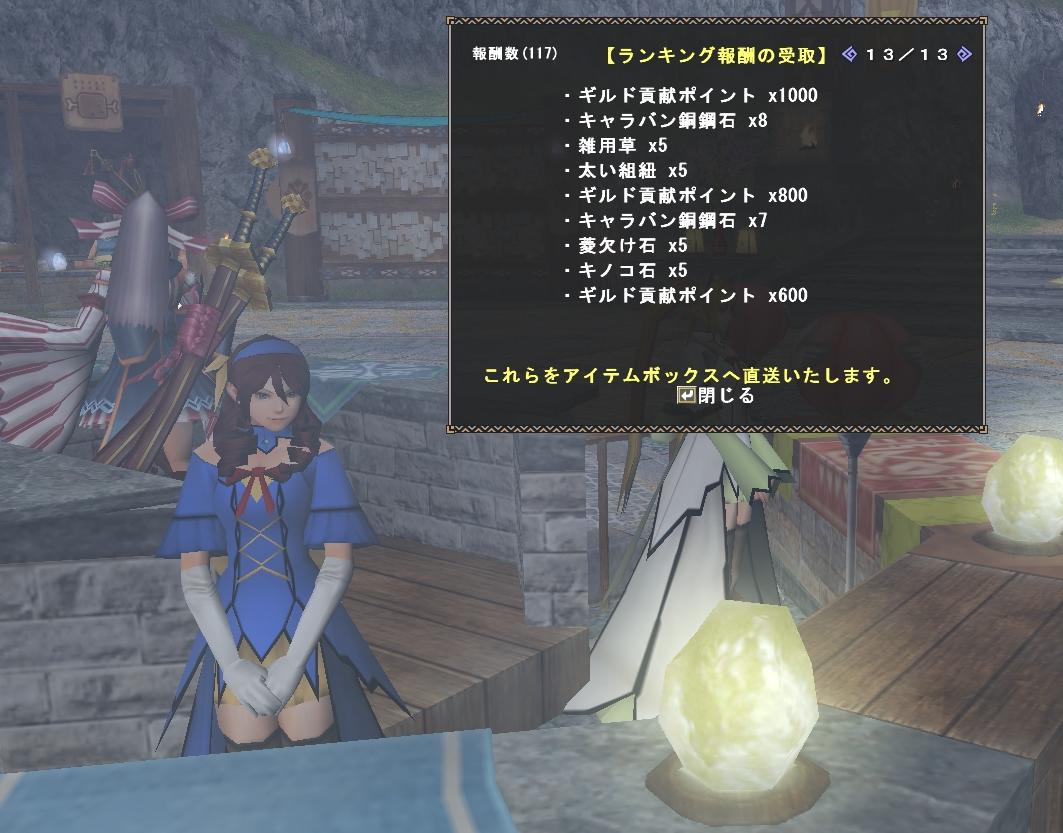 昨日の記録 朝少し遅めにイン、巨大魚杯はハレツアロワナがランクBなのに300位台まで落ちる。珠玉バルラガルを募集したけど参加者さんいらっしゃらないのでラスタさん達とクリアできる、ドスランポスが邪魔でしょうがないけど剥ぎ取りでHC素材出してくれたから良し!としてあげよう。珠玉グレンの装備自由募集があったので参加し4戦してお別れ休憩ログアウト。 極限征伐はまったくやる気が無くなって昼にMでインして珠玉グレンをしてAにチェンジしてなわばりパリアを2戦してログアウト。Aの弓装備を整えてあげないと素材集め...