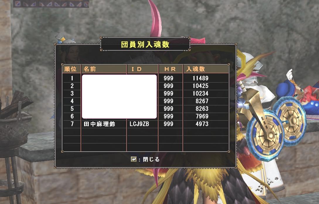 昨日の記録 朝にインしてこの記録を更新しながらGエスピ高台放置していると団長さんインされてお話、予定通り6時5分前に戻って試練待ち。同盟の方もインされて3人で今回の目玉イナガミを回す、3戦ほどしたところで団員さんインして4人体制、7時に団員さん所用でログアウトで3人体制に戻るけど安定の1ラスタ、ギルド貢献Pは貯まらないけど入魂はドンドン貯まる。終わってみれば7000魂を超えていた。それでもダントツビリからビリに半歩前進しただけ。団長さんと同盟さんは定番?アクラ棍で麻痺とスタンに高い位置にある...
