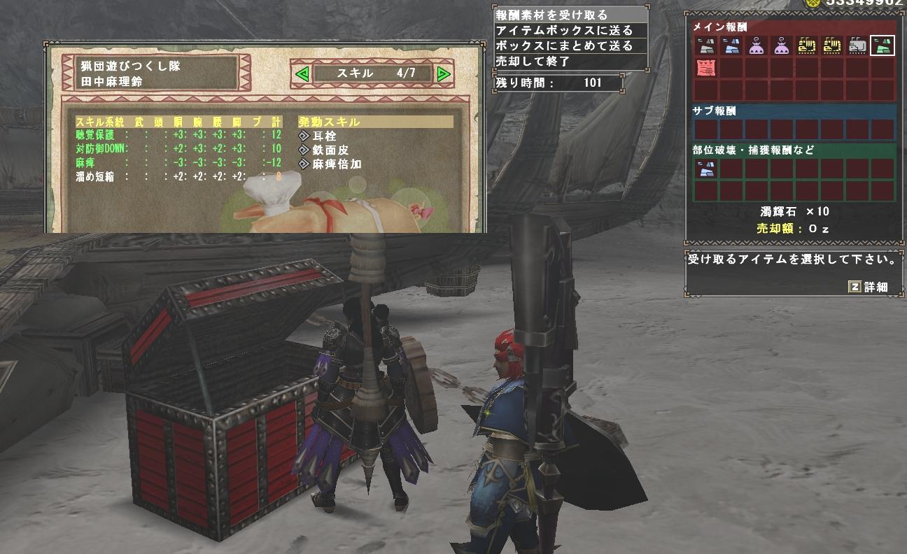 昨日の記録 朝にインしてこの記録更新をGHCエスピの高台で入力したけどラスタさん達が不調らしく20分すぎてパートナーの体力半分報告、残り10分コールから攻撃に参加したけどホントギリギリでクリア、安定の放置プレイは難しいみたい。 イベントのハンマークエストバサルに行って以前の配信と同じでスカルフェイスを強制装着させられてドキドキしながらバサル攻撃、支給品の眠り投げナイフと爆弾でダメージを稼ぎ慎重にヒット&ウェイでクリア。2回目は団訪問レスタを使って攻撃お任せして捕獲ラインを知らせてくれたら閃光...