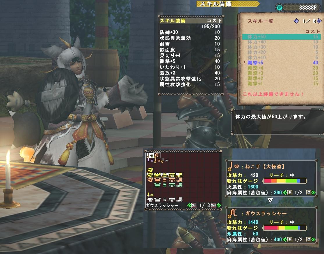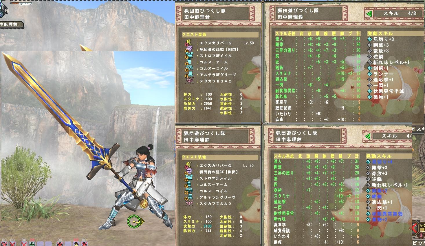 昨日の記録 朝にインしてアルテラ脚防具のためGHCフルフル、4戦目でパートナーがHC素材持ち帰りで一応適応撃スキル発動できる装備セット完成?剣尾で強化ストップしたのでみなもと持って烈種ゼル。前半(パートナーが教えてくれる)で回復G消費は9個、もしかしてと期待したけど攻撃が強力になってみなもと服用、20分かかり回復G21個(プーギーの差し入れ含む)使ってクリア。尻尾は1本だけであと2本だけど疲れたし時間なのでログアウト。 スキルは盛りだくさん!上段は広場での数値下段は☆7クエストでの数値で防御力...