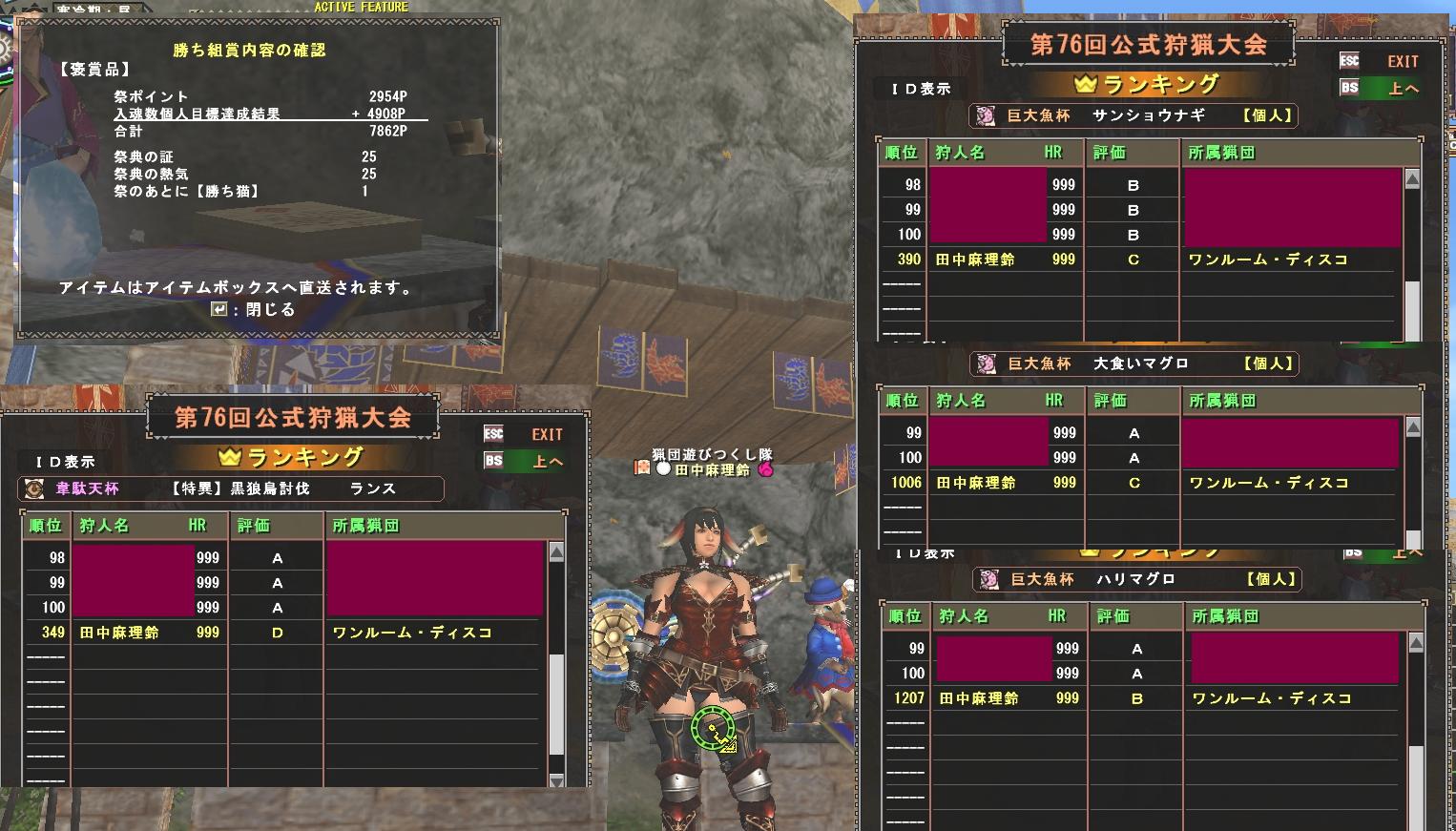 昨日の記録 前日の雨も止んでずぶ濡れになった疲れも取れたので夜明け前なのに近所のコンビニにいってビットキャッシュ購入して課金。 祭PでGグレン素材を交換してグレン剣珠GX2精錬しようと目論んでいたけど交換素材にはグレン素材が無かった・・・ ・。G級HC素材等1万Pほど交換して今回の祭褒賞を受領 韋駄天は1回しかしなかったけど予定通り入賞、巨大魚杯は初の4桁順位だけど回数行かなかったし当然の結果。 新モンスターのディオレックスに行ってみた、バルラガル・メラギナス・フォロクルルと初見でクリア出来...