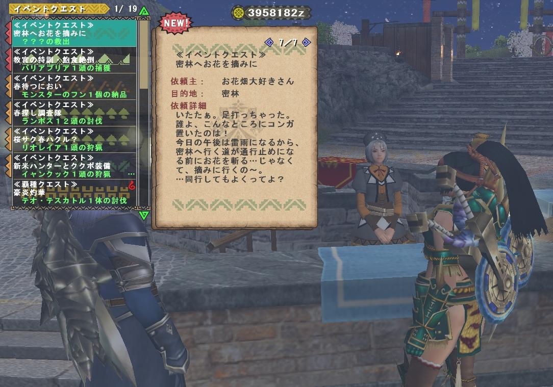 昨日の記録 朝にインしてエイプリルフール限定クエスト、 隣の人はアスール装備 いろいろ試してみたけどクリアできない、黄色い汚臭にまみれてクエスト失敗を続けると気分が悪くなってきたのでほかのブログで正解を覗く。支給品の剣晶装着してハンマー使用が正解らしく、オンラインマニュアルで剣晶のつけ方を読んで何とかクリア。報酬は香来草だけでちょっと捻りが効いていない感想、それにHR5〜受注できるけど低HRで剣晶装着なんて無理だと思う・・・。夜にZで雷属性ハンマーで剣晶未使用でもクリアできること確認。 1時...