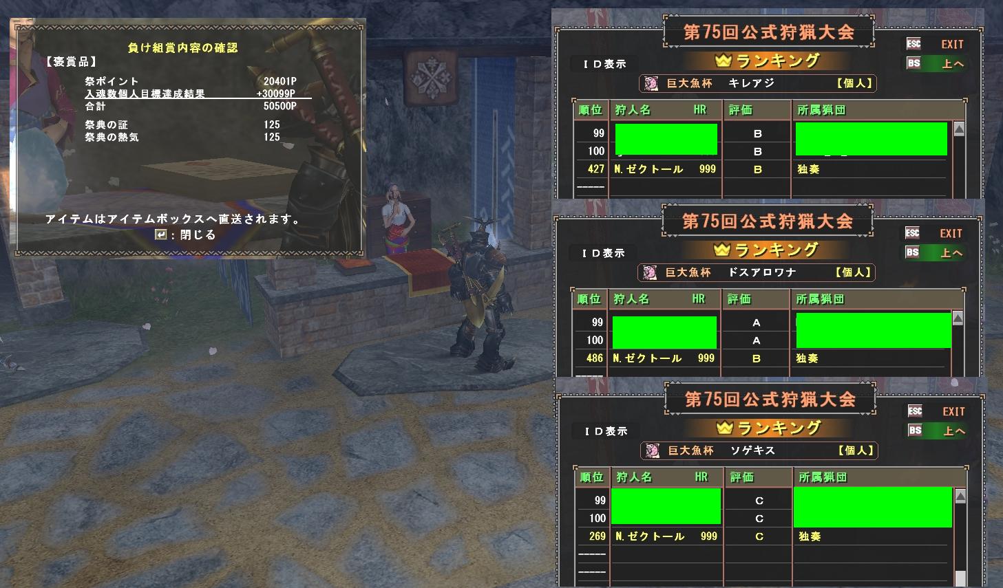 昨日の記録 朝にZでイン、1日限定配信のGRPガノトトスで猫クジカードを集めるためで自分としては頑張って連戦し1回だけ5分を切れた、報酬はブーストされないアナザー枠でほとんど3枚たま〜に4枚で1回だけ15枚ゲット!。 アノルの素材を祭Pで交換して武器強化もして褒章を受け取る 5万Pと大量ゲットで次回の祭はポイント〇倍にはならないと思うけど少し消化してフローしないようにしておかなければいけない、巨大魚杯もなんとか500位入賞できたし結果的には良い祭だった?。 午後にMでインしてせっせとルロウスイ...