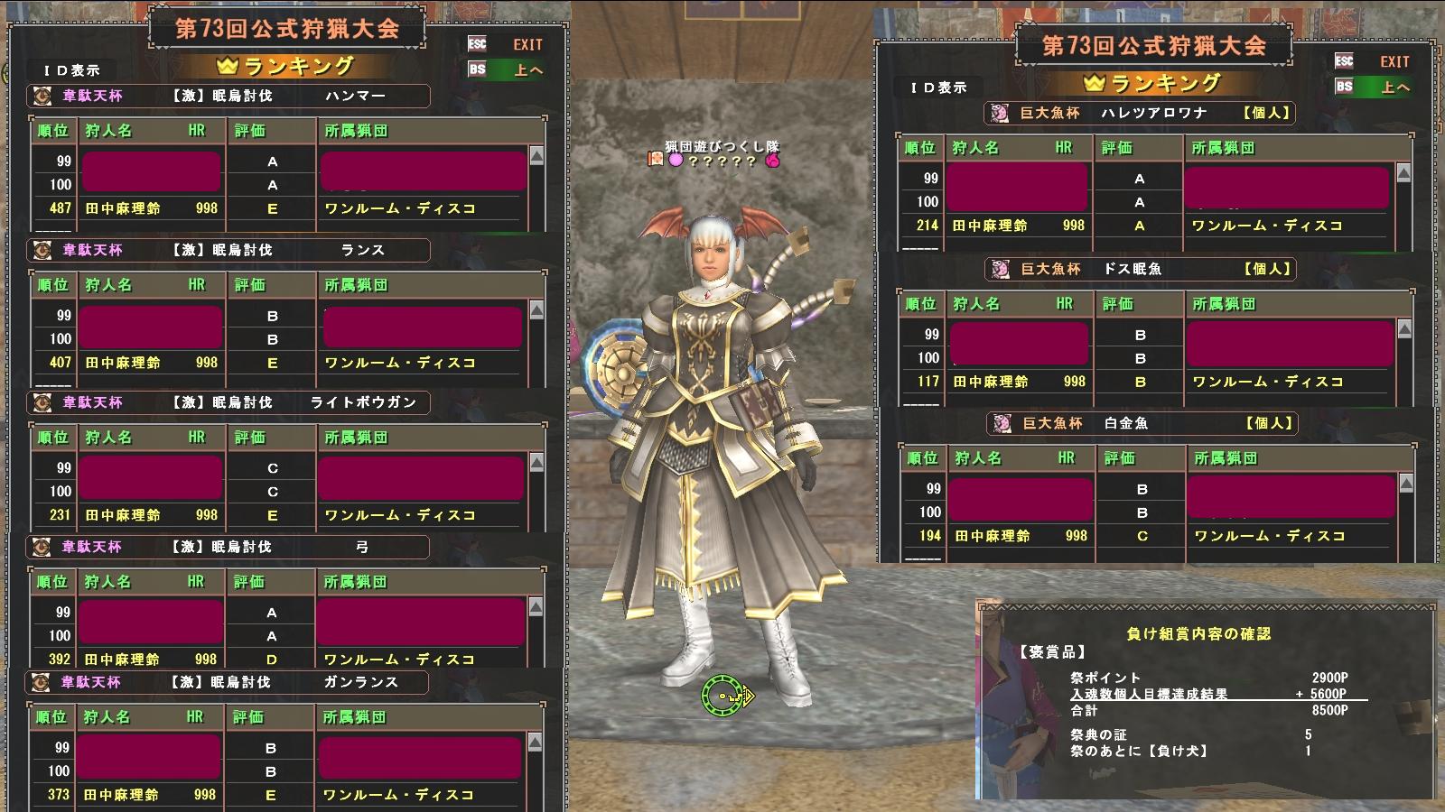昨日の記録 メンテの日で夕方イン、少しだけ終わりなき襲撃を募集連戦、流れている募集チャットはG武器指定や秘伝指定だったり逆に「イベレイアココ!」だけだったりで参加しづらい。装備自由で張り主のMは覇種武器なんて豪華なものじゃないから天嵐武器ですよと明示して募集、集まらないかもと思ったけど以外にすぐ満員になり出発できた、5戦とも1エリアでクリアできたしHC素材も10枠出たので満足。 夕食後Zでインして久〜しぶりのログイン挨拶チャット、団員さんがお一人インされていて前日のお礼を言って毎日特典消化、シ...