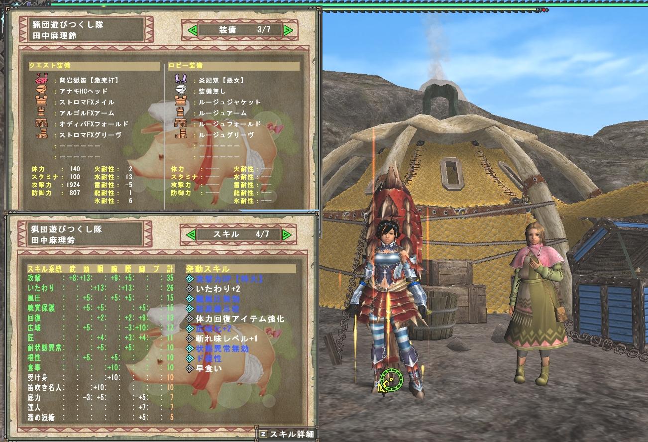 昨日の記録 朝にインしてイベント消化、先ずはグーク広場改装図面クエスト。Zでの苦労を踏まえて剥ぎ取り装備でGO!ボロ虫網が本領発揮で壊れるコワレル・・11個目を使用しているところでロイヤルカブト3匹目捕獲、途中で会ったクックを倒したけど鱗は剥ぎ取れず蜂の巣の下でゴソゴソしたけハチミツばかりで離れ小島まで行って採集しても採れずにリタイアかと思ったら画面右上に動きがあってクックが再登場(剥ぎ取り装備は自動マーキングスキル付き)、無限湧き仕様?かも、早速クックを倒し剥ぎ取って鱗も入手し埋めておいたマ...