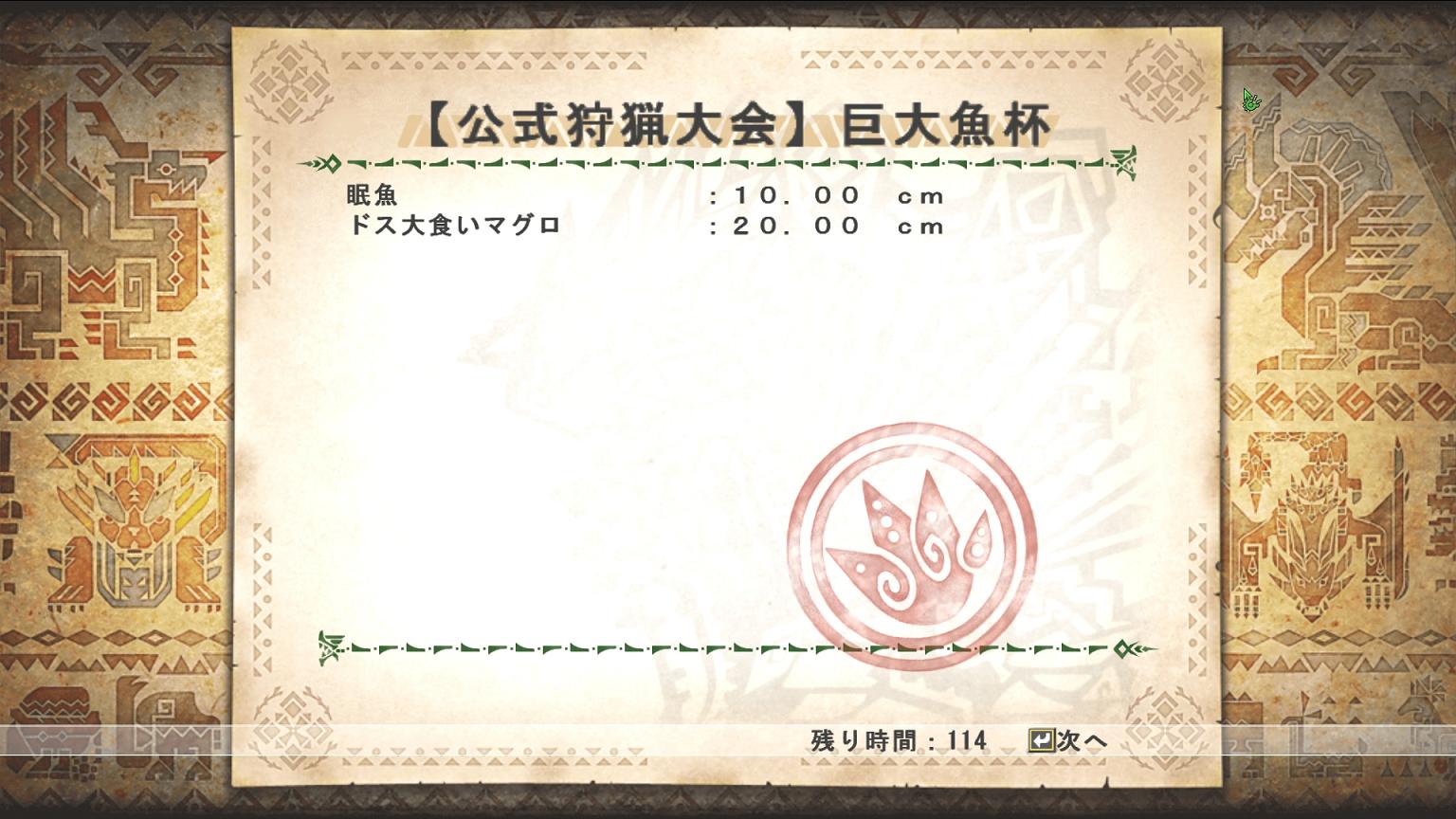 昨日の記録 朝、予想通り外は雪が薄っすら積もりとても寒い。街はきっと公務員のボーナスも出て賑わうだろうから1日MHFすることに。 巨大魚杯は入賞圏内っぽいので優先依頼の剛グレン朝食前後に40分ほどづつ連戦して大弓鬼まであと1部位、弓魂極も無くなったので優先依頼のバサルをしたけど3戦で飽きる。韋駄天が参加するだけで入賞できそうな感じなので太刀・大剣・ハンマー・笛で1回づつクリアし今回は6種目参加。 お昼寝後Zでインして眠魚が7?台の400位台なのでせめて10?の記録更新を目指し釣行、何度か通って ...